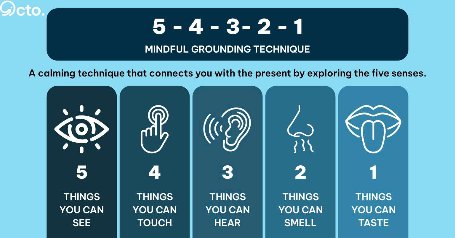 Much of the anxiety and stress comes from overthinking. The 5-4-3-2-1 exercise is a method to "anchor" your mind in the present moment through your senses. It helps redirect your attention away from anxious thoughts, bringing you back to "ground" and allowing you to regain control over your thoughts.